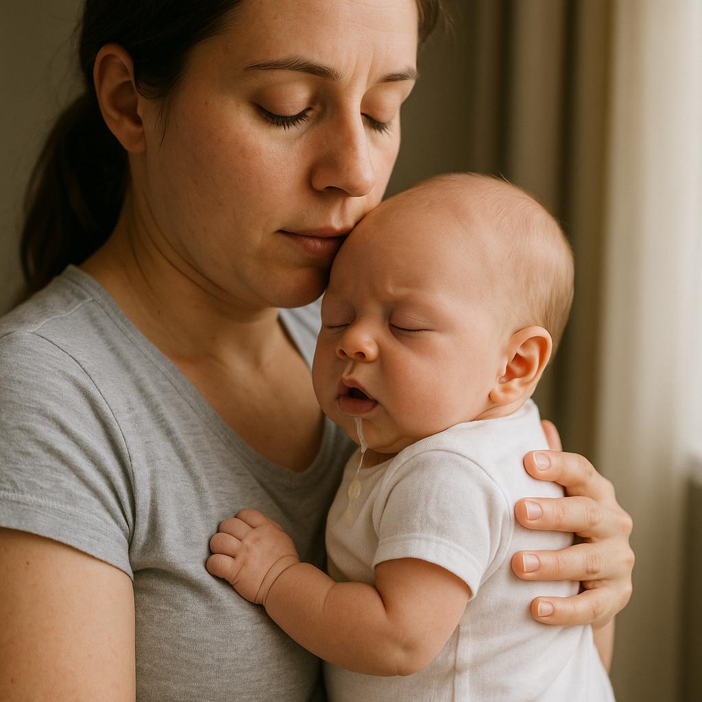 Если ребенок срыгивает после кормления, его нужно немножко подержать в вертикальном положении.
