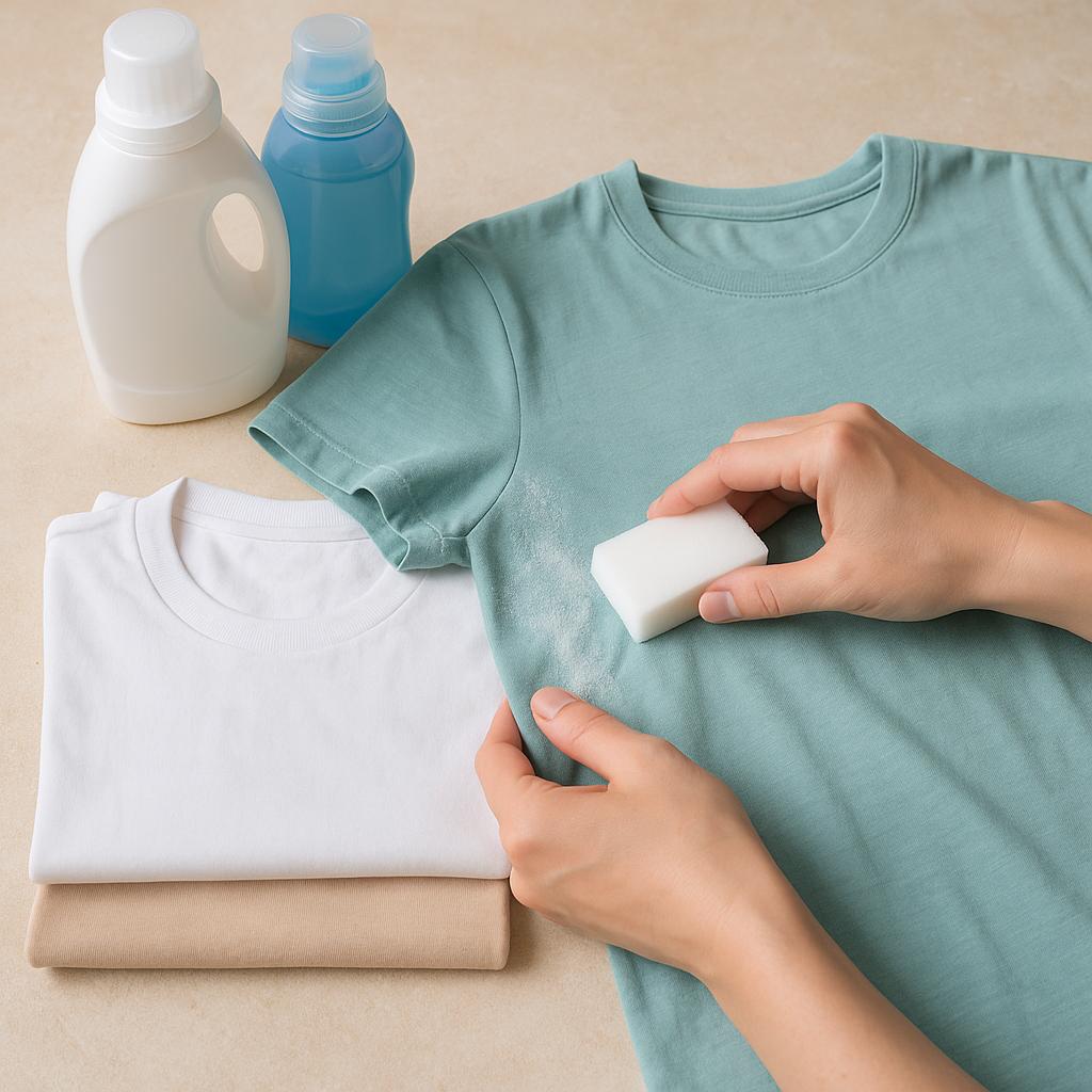 Тщательно перемешайте жидкости, а затем вылейте смесь на пятна пота и антиперспиранта. Дайте вещи полежать 5 минут, затем сполосните в прохладной воде и выстирайте с хозяйственным мылом.