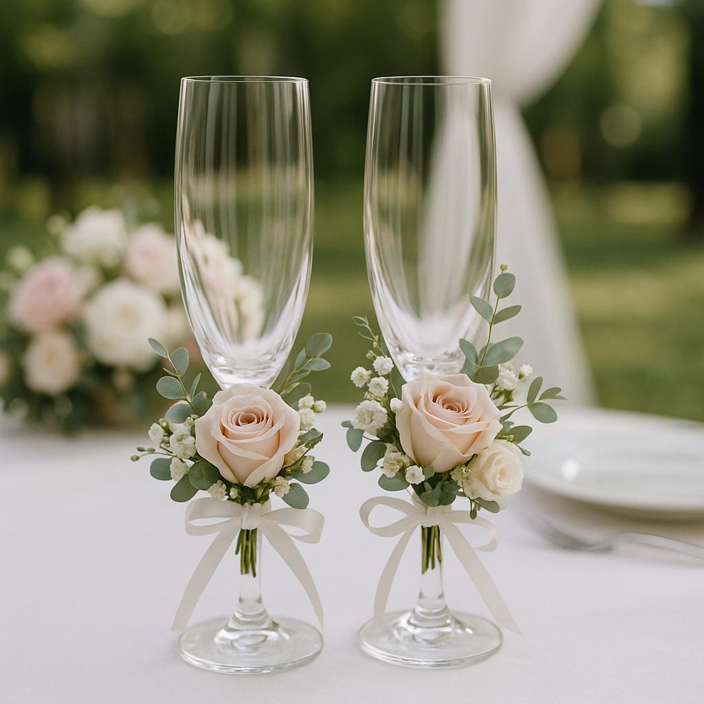 Украсить свадебные бокалы можно настоящим символом романтизма — цветами.
