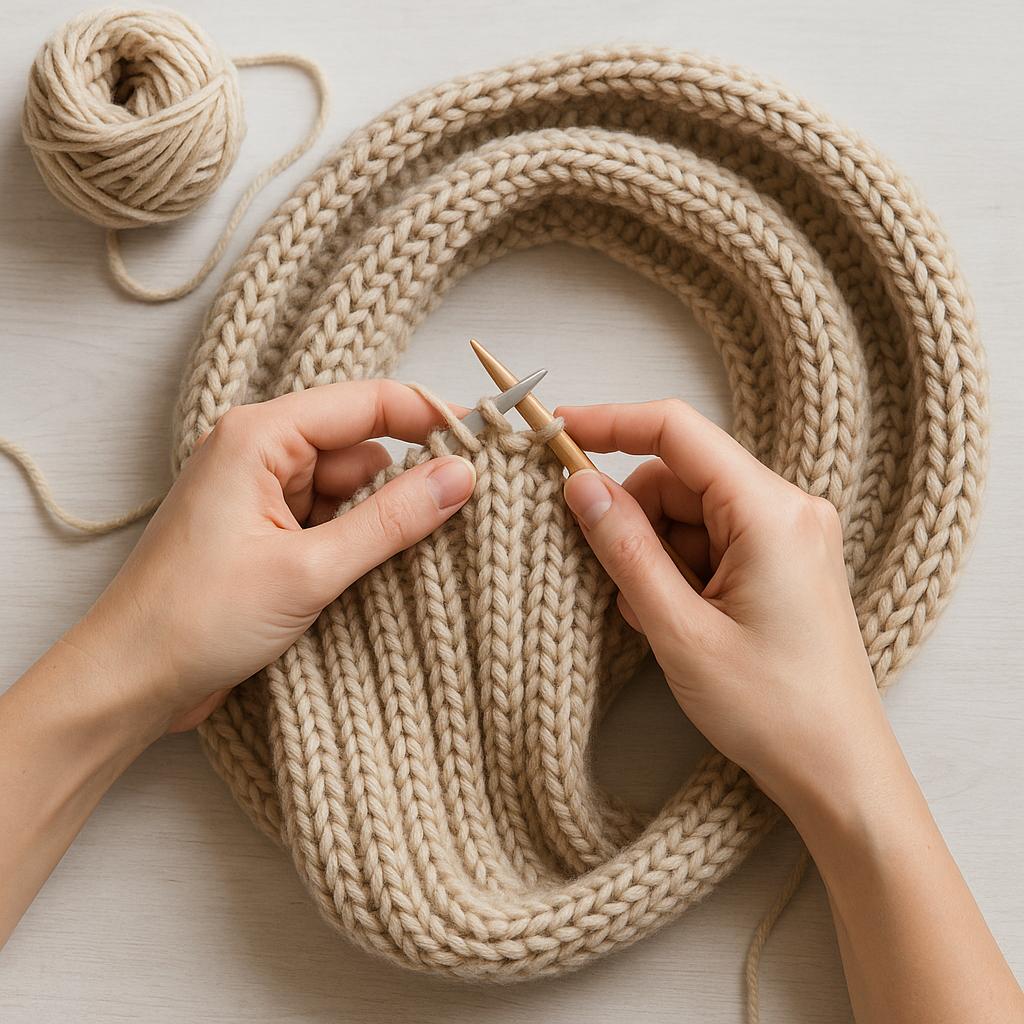 Как правильно вязать круговой шарф? Схема: I, II рядок — одна лицевая петля, одна изнаночная, чередование происходит до конца ряда; III, IV рядок: 1 изнаночная, 1 лицевая, чередовать до конца ряда.