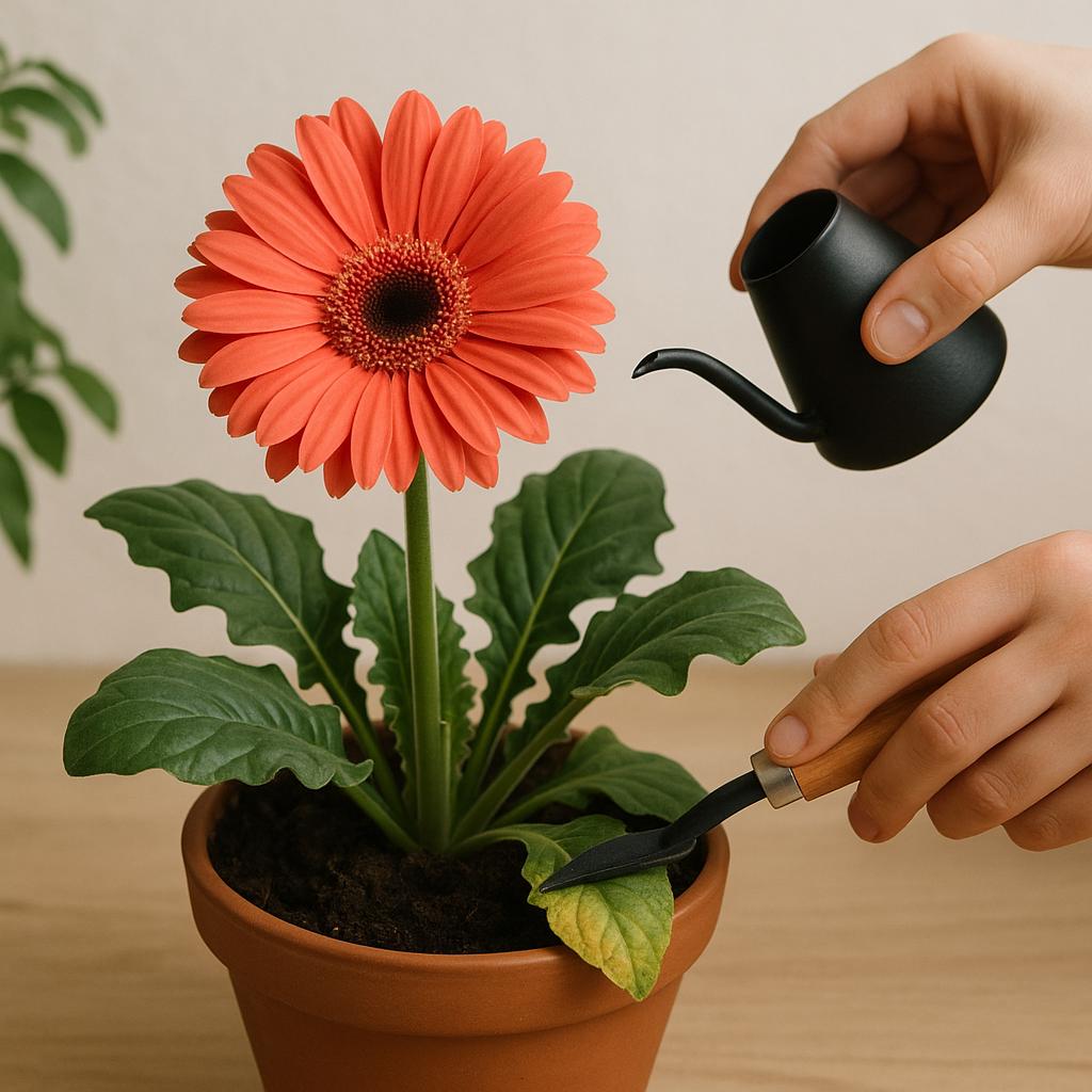 - Правильному поливу герберы уделите особое внимание. Это ключевой момент в выращивании. Поливайте только теплой отстоянной водой. Холодная противопоказана, т.к. может вызвать заболевание, и растение погибнет.