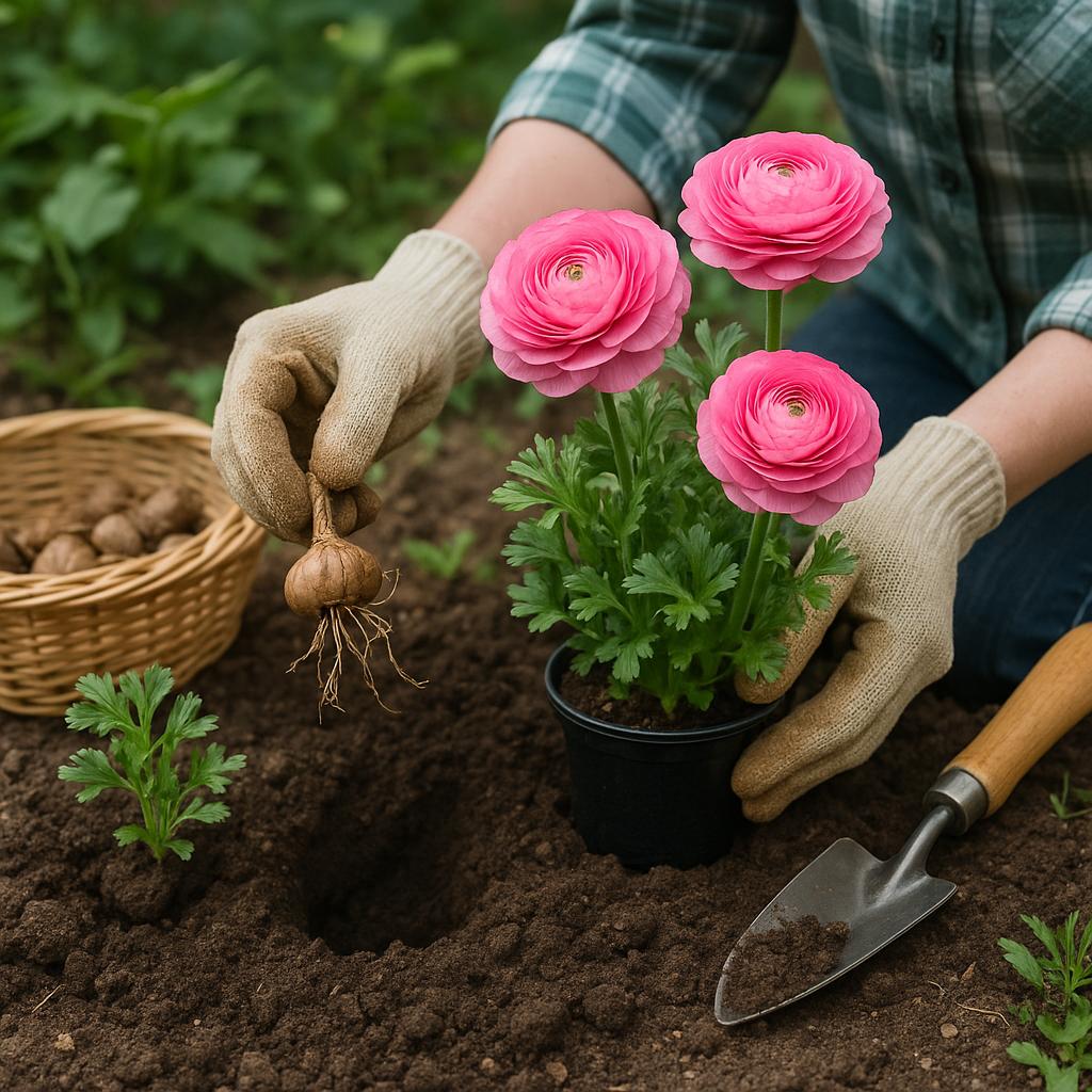 У цветов ранункулюс посадка корневищ осуществляется в открытый грунт в апреле. Земля к этому времени уже достаточно прогреется, и угрозы заморозков нет. Перед посадкой корневища рекомендуется замочить в воде часа на 2 или подержать в мокрых опилках. В целях защиты от гнили посадочный материал обрабатывается средством «Максим».