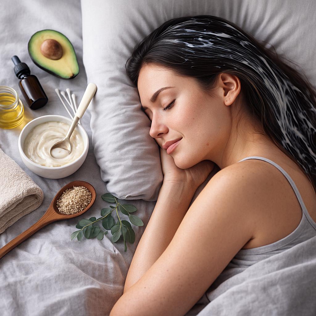 Сон для человеческого организма — период покоя и роста. Как правильно замечено, мы растем во сне. Волосы и их рост в полной мере этому соответствуют. Пиковая фаза роста приходится на время сна, в это же время происходит активное обновление структуры. Применяя все эти особенности себе во благо, можно, используя маску для волос на ночь, повысить в несколько раз ее эффективность. Маски для волос, оставленные на все время сна, оказывают длительное положительное влияние на отдыхающие от вредных внешних воздействий и растущие волосы. Благодаря этому эффективность маски, по сравнению с использованием в дневные часы, возрастает в несколько раз. При применении необходимо тщательно подходить к подбору состава маски. Не нужно использовать маски, содержащие жгучие, согревающие или другие активные вещества, раздражающие кожу головы при длительном применении. Это компоненты, содержащие: