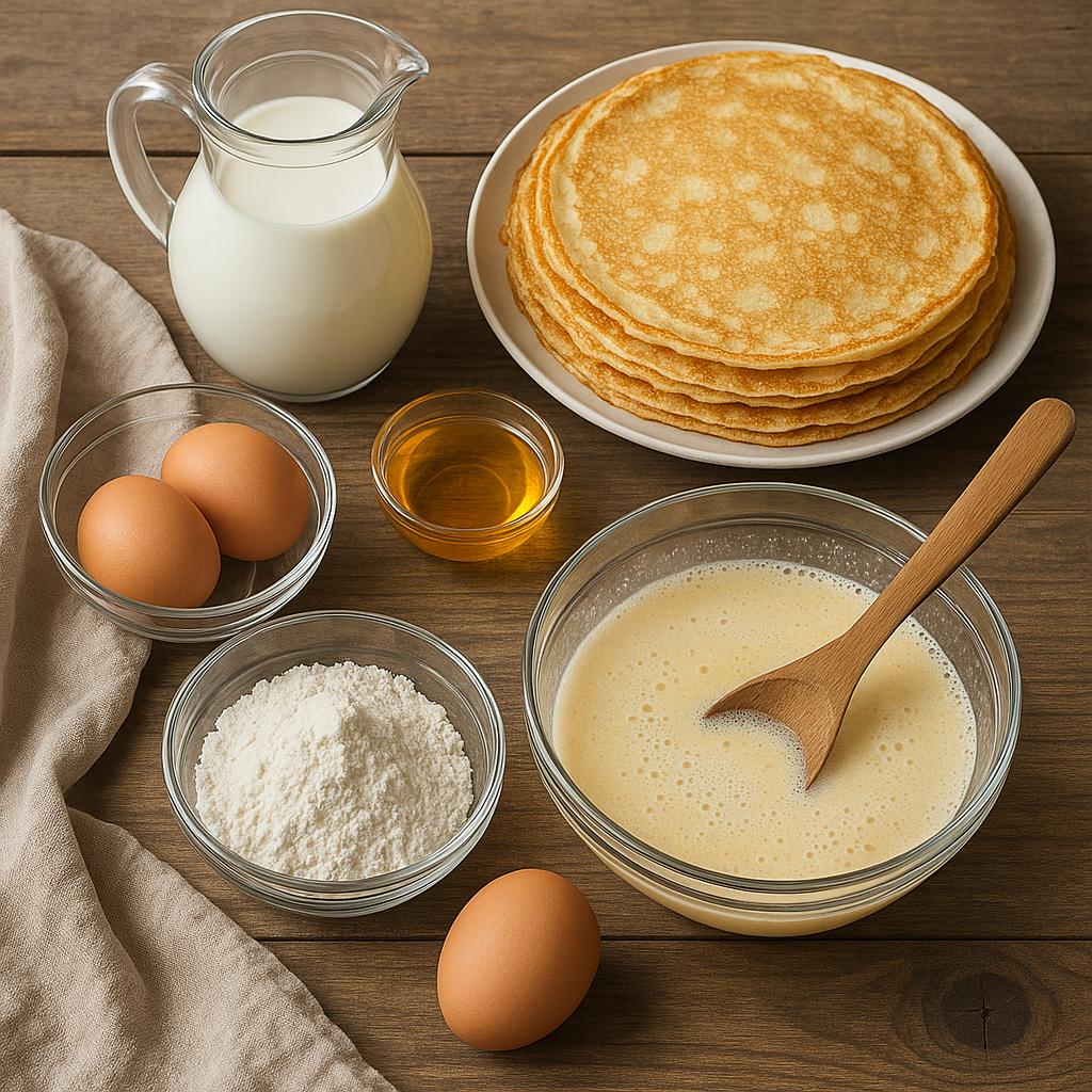 Рецепт приготовления включает в себя следующие ингредиенты: пол литра молока, 2 яйца, 200 грамм муки, 2 ст. л. подсолнечного масла, 1-2 ст. л. сахара, соль (не более щепотки).