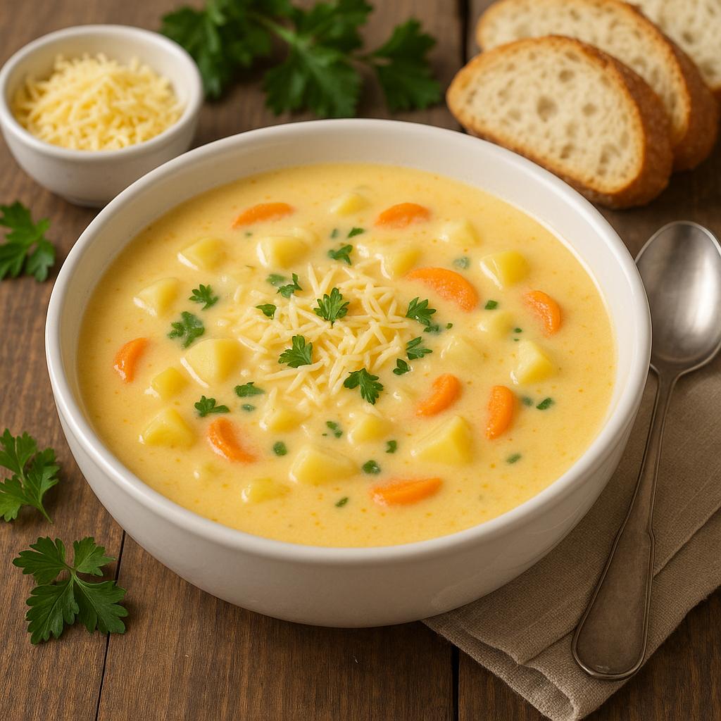 Талантливые кулинары смогли разработать рецепт, в котором невероятно гармонично сочетаются красивые овощные оттенки и сливочный вкус сыра. Диетическое блюдо готовят не на мясном бульоне. Можно отказаться от добавления муки. Заменить твердый сыр лучше всего плавленым сырком «Дружба».