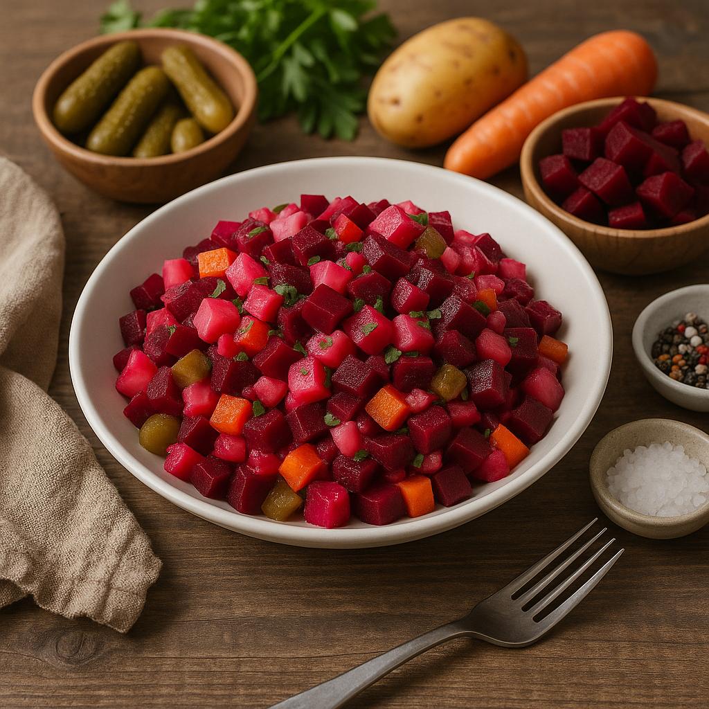 Красиво оформленный винегрет, станет отличным украшением праздничного стола.