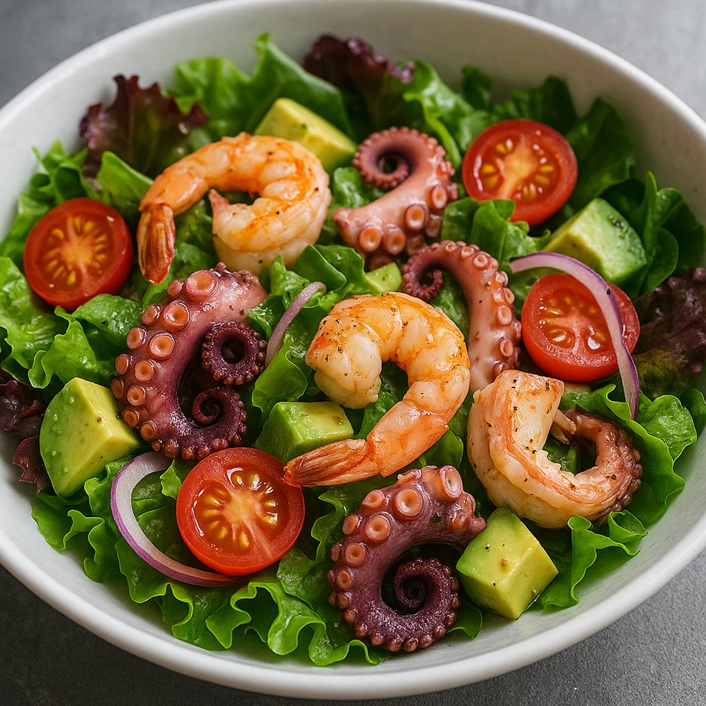 В рецептах салатов из морепродуктов часто используются креветки, красная рыба, кальмары, крабовые палочки и красная икра.