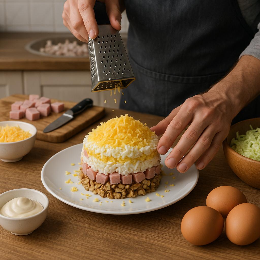 Чтобы салат стал сытнее, добавьте слой вареной картошки.