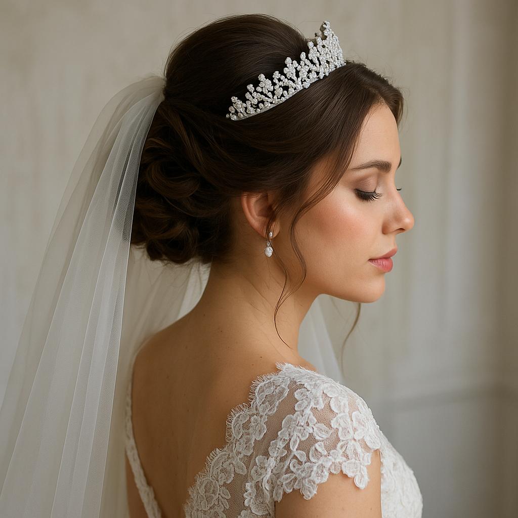 Свадебная прическа под диадему и фату не должна содержать множества разнородных элементов, она должна быть броской, но поддерживать стиль, соответствующий выбранному украшению.